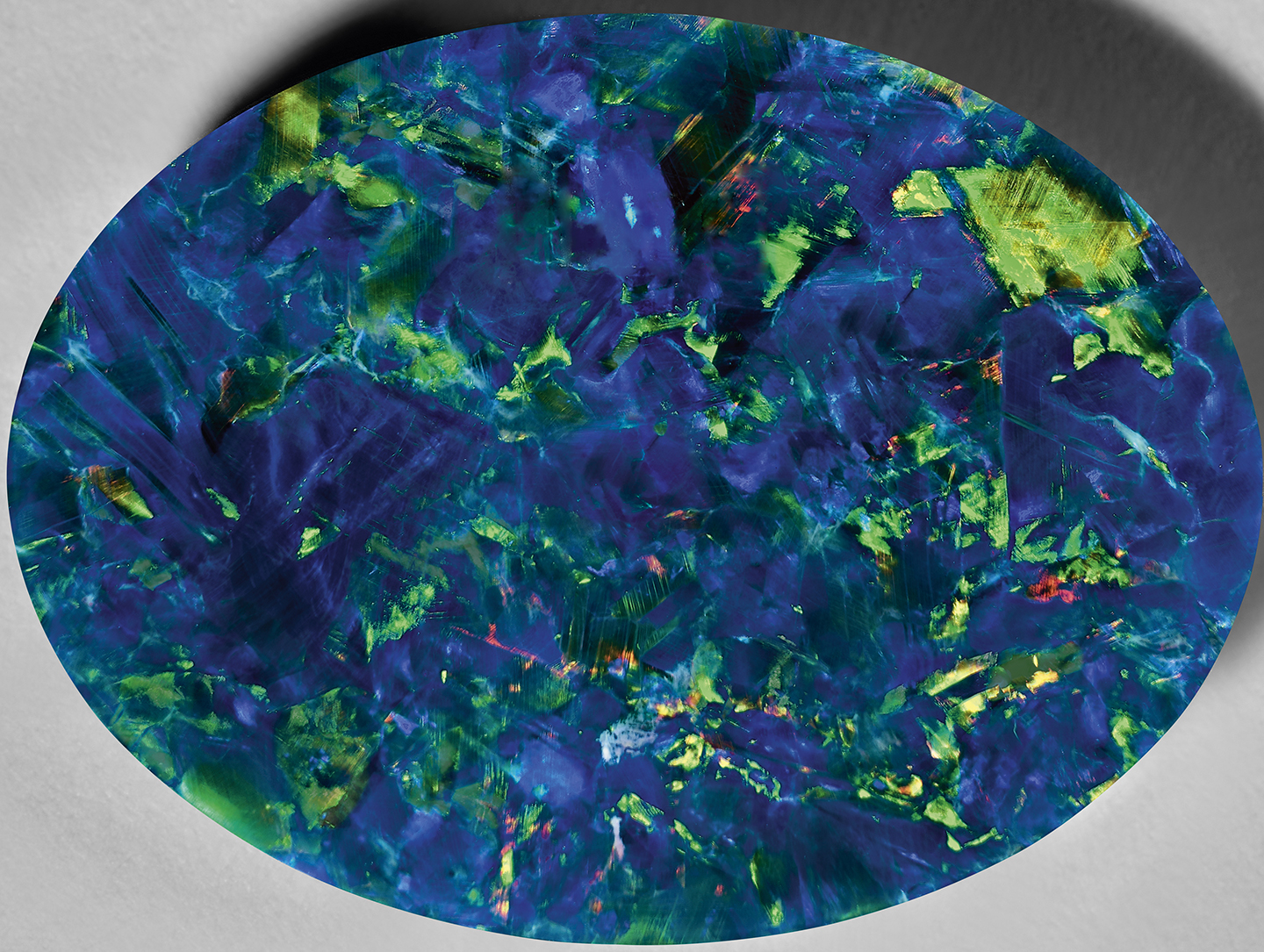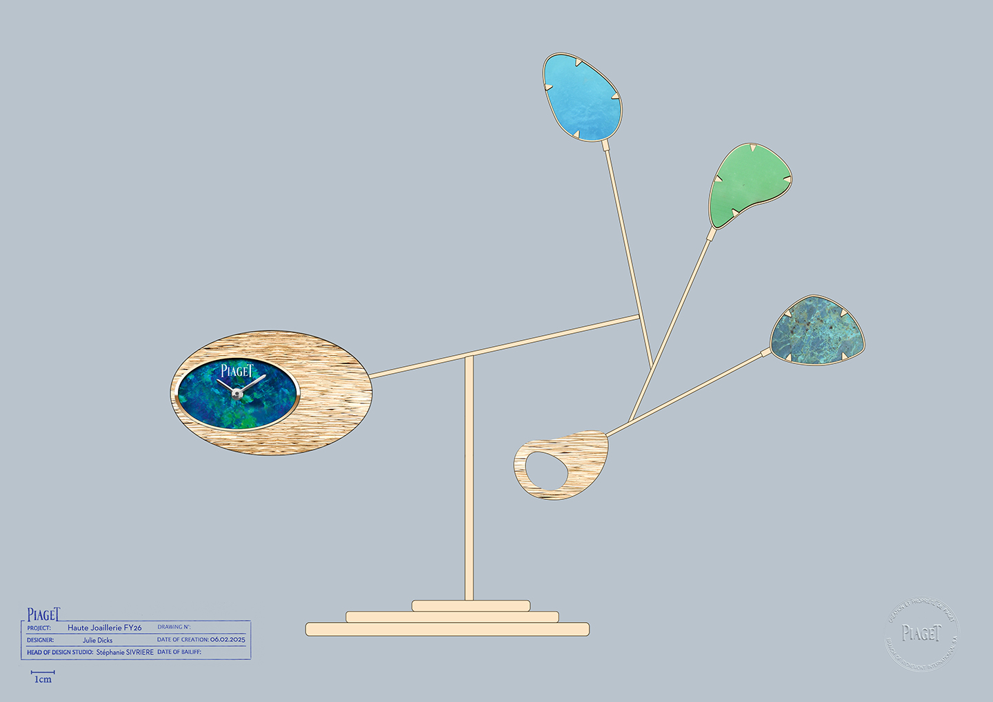 โดยนาฬิกาตั้งโต๊ะนี้ประกอบด้วยหน้าปัดโอปอลสีดำขนาดใหญ่รูปทรงรีแนวนอน ประดับด้วยทองที่ตกแต่ง ในลวดลาย Decor Palace โดยกิ่งก้านของโครงสร้างโมบายที่แผ่ขยายออก ซึ่งแต่ละกิ่งประดับด้วยหินล้ำค่าที่มีรูปร่างตามธรรมชาติในเฉดสีน้ำเงินและเขียว เพื่อให้สะท้อนแสงวาบของโอปอลสีดำ เช่นเดียวกับส่วนฐานที่หยิบเอาความสง่างามของ Petersite (ปีเตอร์ไซต์) Verdite (เวอร์ไดต์) และ Sodalite (โซดาไลต์) มาซ้อนทับกันได้อย่างสร้างสรรค์