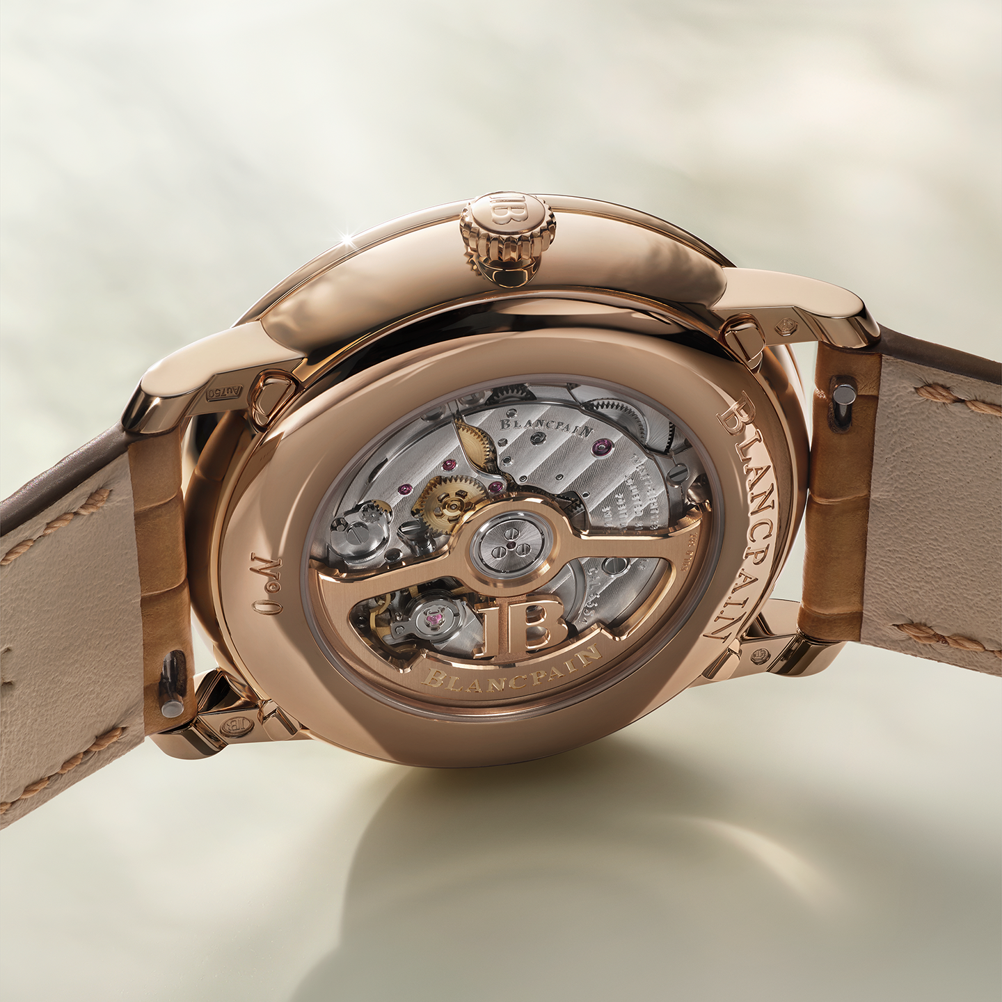 ด้านหลังตัวเรือนกรุคริสตัลแซฟไฟร์ เผยให้เห็นหัวใจการทำงานของกลไกที่จัดวางอย่างสวยงาม โรเตอร์แบบโปร่งขอบลบมุมและตกแต่งอย่างประณีตเผยให้เห็นหัวใจของกลไกภายใน สะท้อนถึงความประณีตแห่งงานตกแต่งชั้นสูงความเป็นเลิศทางกลไก ขับเคลื่อนด้วยกลไกการทำงานแบบอัตโนมัติที่ผลิตขึ้นภายในโรงงานตามขนบของ Haute Horlogerie (Côtes de Genève, beveling) สำหรับรุ่น complete calendar ผู้สวมใส่สามารถตั้งค่าปฏิทินได้ทุกเวลาตามต้องการ โดยเป็นระบบที่ Blancpain ได้จดสิทธิบัตรเฉพาะไว้ รับประกันเป็นระยะเวลา 5 ปี