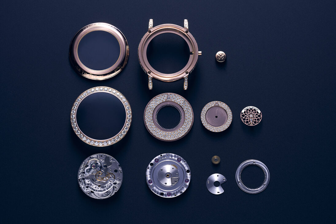 ขณะที่แท่นเครื่องกลางซึ่งรองรับเพชรเม็ดเดี่ยวที่ประดับไว้ภายในลวดลายเรขาคณิตอันละเอียดอ่อน ชวนให้นึกถึง spirograph (สไปโรกราฟ) ซึ่งออกแบบมาเพื่อตอกย้ำถึงหัวใจสำคัญของการหมุนด้วยลวดลายเรขาคณิตอันซับซ้อน สะท้อนถึงการเคลื่อนไหวอย่างต่อเนื่องของดิสก์หมุนทั้งสามแผ่น เผยนิยามอันมีเอกลักษณ์เฉพาะของนาฬิกาในการวัดค่าเวลา ผ่านงานออกแบบบนตัวเรือนของการเล่นซ้อนกันระหว่างการเคลื่อนไหวและแสง โดยลวดลายเรขาคณิตในงานออกแบบนี้ไม่เพียงฉลองธรรมชาติของวัฏจักรเวลา สะท้อนความโดดเด่นงานฝีมือในห้วงเวลาที่แตกต่างอย่างแท้จริง