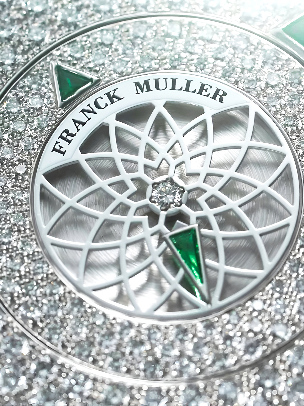 โดยทีมวิศวกรของแฟรงค์ มุลเลอร์ ได้เลือกสรรอะลูมิเนียม ซึ่งเป็นตัวเลือกที่ดีที่สุดสำหรับดิสก์วินาที มอบสมดุลด้านน้ำหนักและแข็งแรงทนทาน ประดับตกแต่งด้วยเพชรหรืออัญมณีเจียระไนทรงสามเหลี่ยม หรือ triangle-cut เป็นตัวแทนองค์ประกอบงานออกแบบเชิงกวี สำหรับการรังสรรค์จานดิสก์กลางแบบสเกเลตันผ่านกระบวนการผลิตด้วยเครื่องจักร อาศัยความแม่นยำในการออกแบบที่บางมาก และแต่ละสะพานจักรวัดความกว้างได้เพียง 0.3 มิลลิเมตร ซึ่งนับเป็นความสำเร็จอันในแง่ของการผลิต