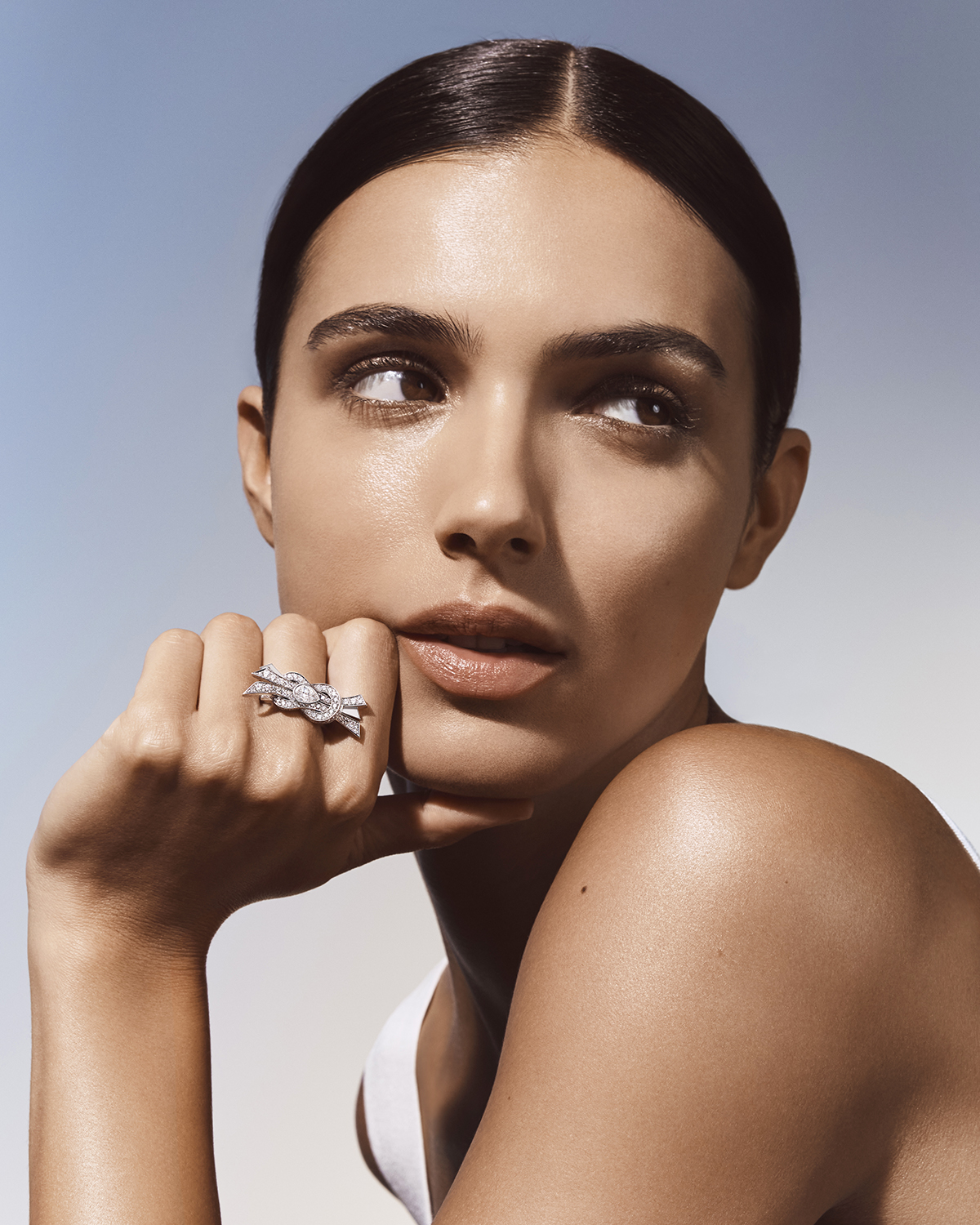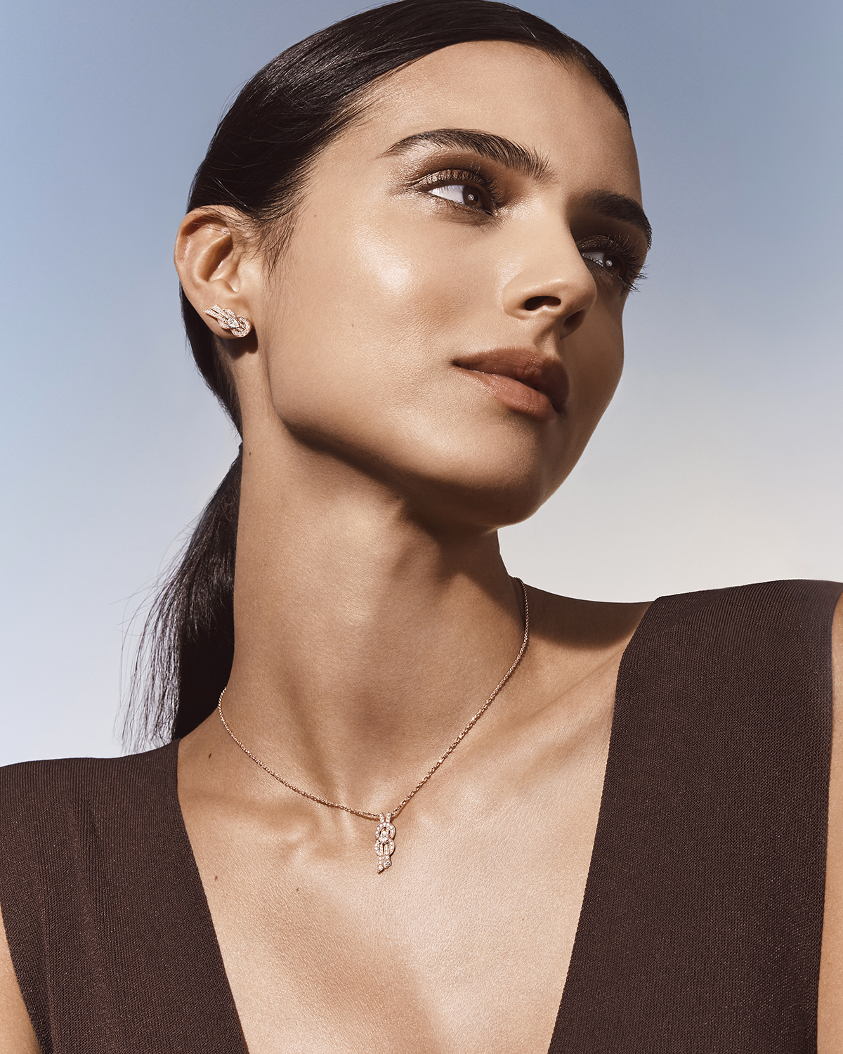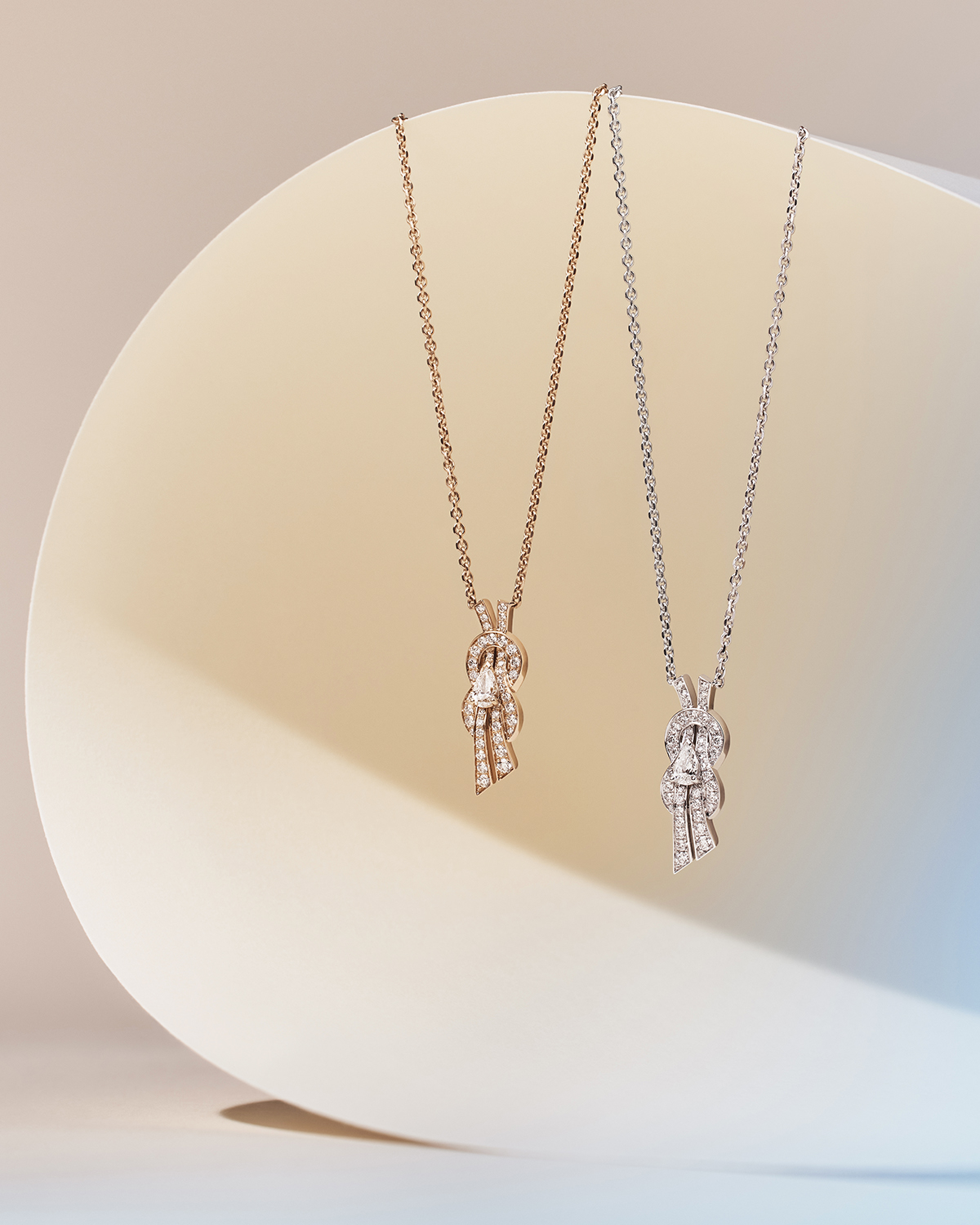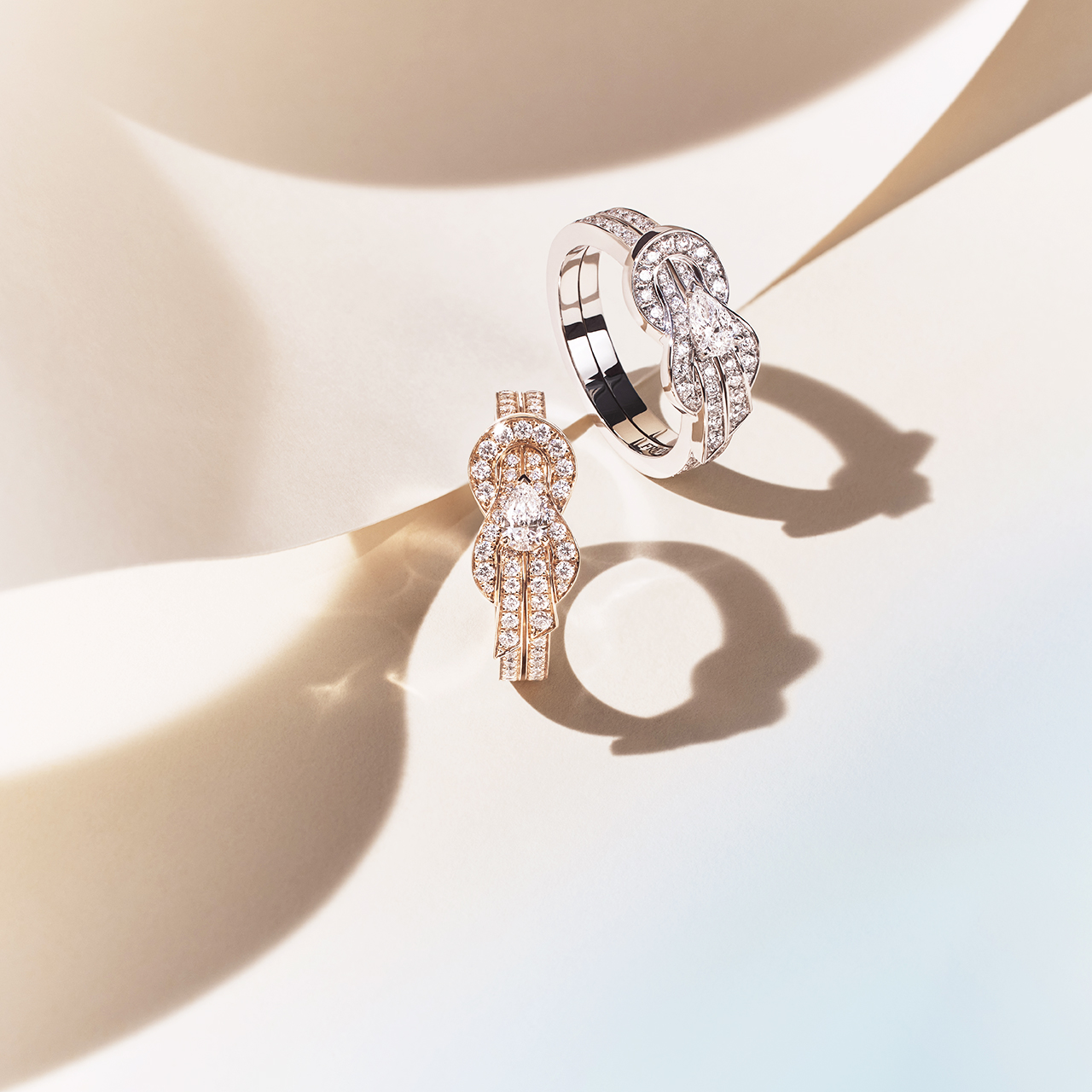 ทองคำสีไวท์โกลด์และทองคำสีพิงค์โกลด์ เผยความงดงามผ่านเครื่องประดับ 3 ชิ้น ได้แก่ แหวน สร้อยคอและต่างหู ถ่ายทอดเสน่ห์อันสดใสของ Chance Infinie ได้อย่างลงตัว สามารถสวมใส่ในรูปทรงเลข 8 หรือหมุนกลับด้านเป็นสัญลักษณ์อินฟินิตี้ โดดเด่นด้วยเพชรทรงหยดน้ำเม็ดกลางรายล้อมด้วยเพชรพาเว่ เส้นสายโค้งมนพลิ้วไหวชวนให้สวมใส่ได้ในทุกวัน