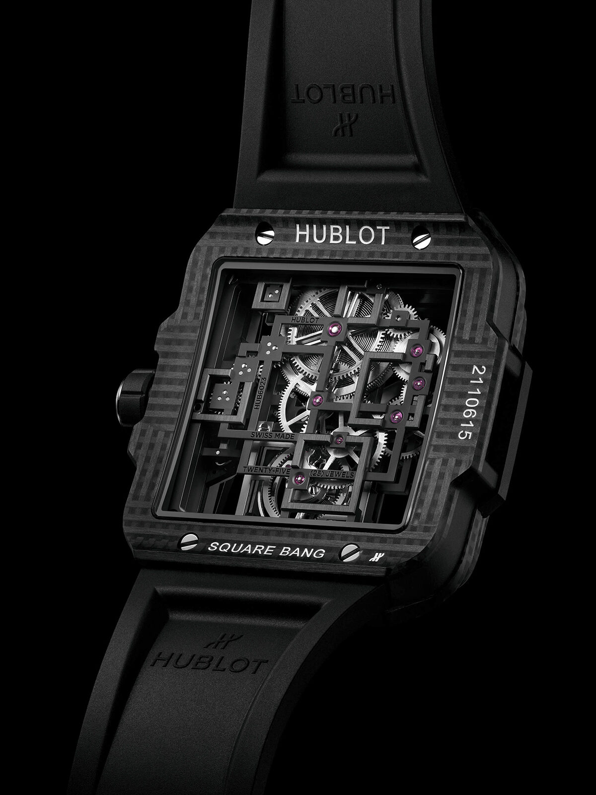 Hublot (อูโบลท์) เปิดตัว Square Bang Tourbillon 4-Day Power Reserve นาฬิกา Square Bang รุ่นแรกที่พลิกโฉมด้วยนวัตกรรมกลไกตูร์บิญง ภายในตัวเรือนทรงสี่เหลี่ยมคาร์บอนไฟเบอร์แบบสามมิติ ขนาด 42 มิลลิเมตร หนา 13.20 มิลลิเมตร ท้าทายกรอบการออกแบบนาฬิกาแบบดั้งเดิม โดดเด่นด้วยวัสดุคอมโพสิตคาร์บอนถักลายแนวตั้งและแนวนอน ที่ออกแบบโดยอ้างอิงจากลวดลายทรงสี่เหลี่ยม เพื่อคงอัตลักษณ์คอลเลกชัน Square Bang โดยรุ่นนี้เป็นนาฬิกาจับเวลารุ่นแรกของคอลเลกชัน รวมถึงเป็นครั้งแรกที่กลไกภายในประกอบด้วยสะพานจักรกลทรงสี่เหลี่ยม สะท้อนความกลมกลืนระหว่างรูปทรงและฟังก์ชันการใช้งาน