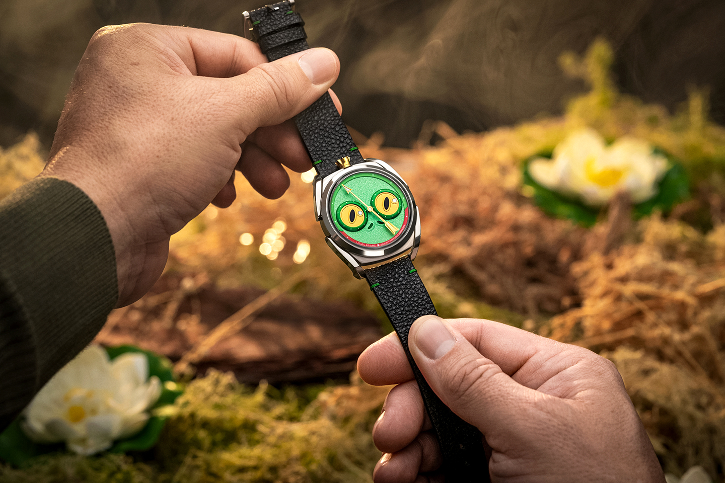 เพราะออกแบบให้ก้าวข้ามกว่าเป็นเพียงเข็มและเม็ดมะยมธรรมดา เราเคยสร้างตูร์บิญงและฟังก์ชันสลับซับซ้อน ดังนั้นครั้งนี้จึงปรับตัวเรือนและพื้นผิวด้วยไทเทเนียม และออกแบบสายหนังจากหนังเคลือบแบบเดียวกับที่ใช้ในชุดเกราะซามูไร แต่ละรายละเอียดล้วนมีความหมาย กบในตำนานรัสเซียคือคาถาที่พรางตัว ส่วนในญี่ปุ่นคือสัญลักษณ์แห่งโชคและความเข้มแข็ง เมื่อรวมกันจึงกลายเป็นไฮบริด กบที่มีหัวใจนักรบ นาฬิกาเรือนนี้ทั้งขี้เล่นและแหวกแนวเล็กน้อย แต่เบื้องหลังความซุกซนคือศาสตร์แห่งการทำนาฬิกาชั้นสูง เป็นเรื่องราวที่ถ่ายทอดผ่านกลไกได้อย่างสมบูรณ์แบบ พลิกมุมมองสร้างความประทับใจ”