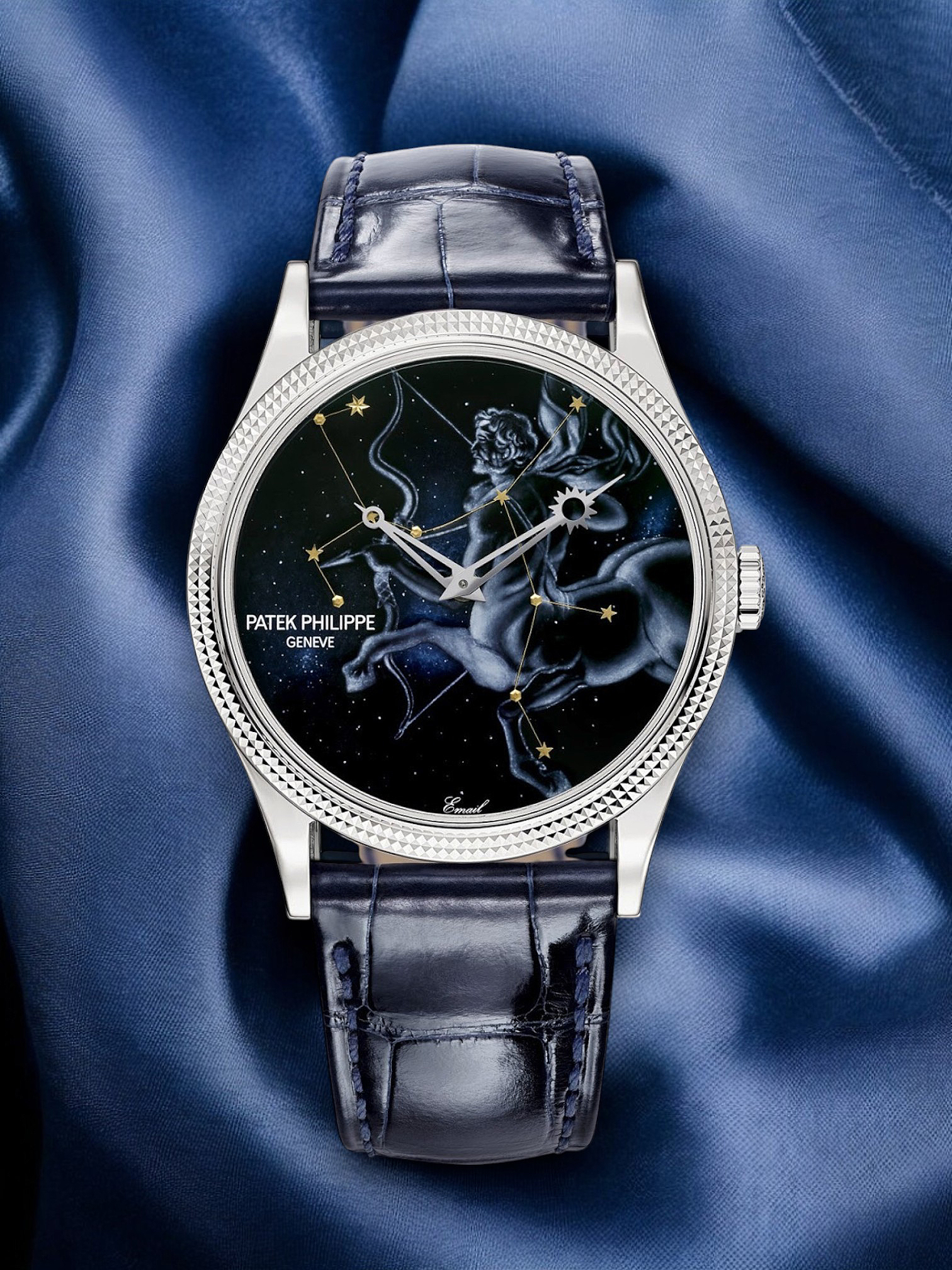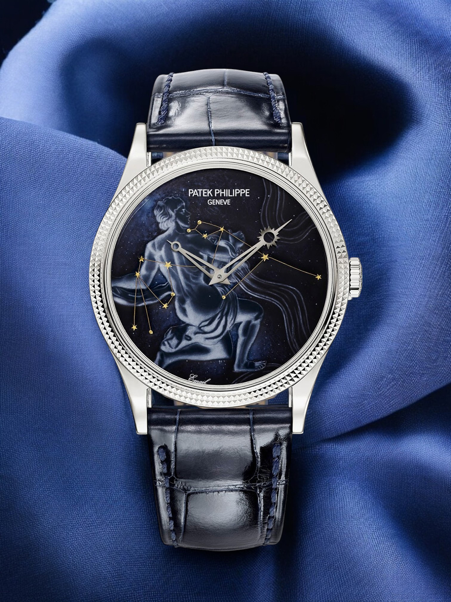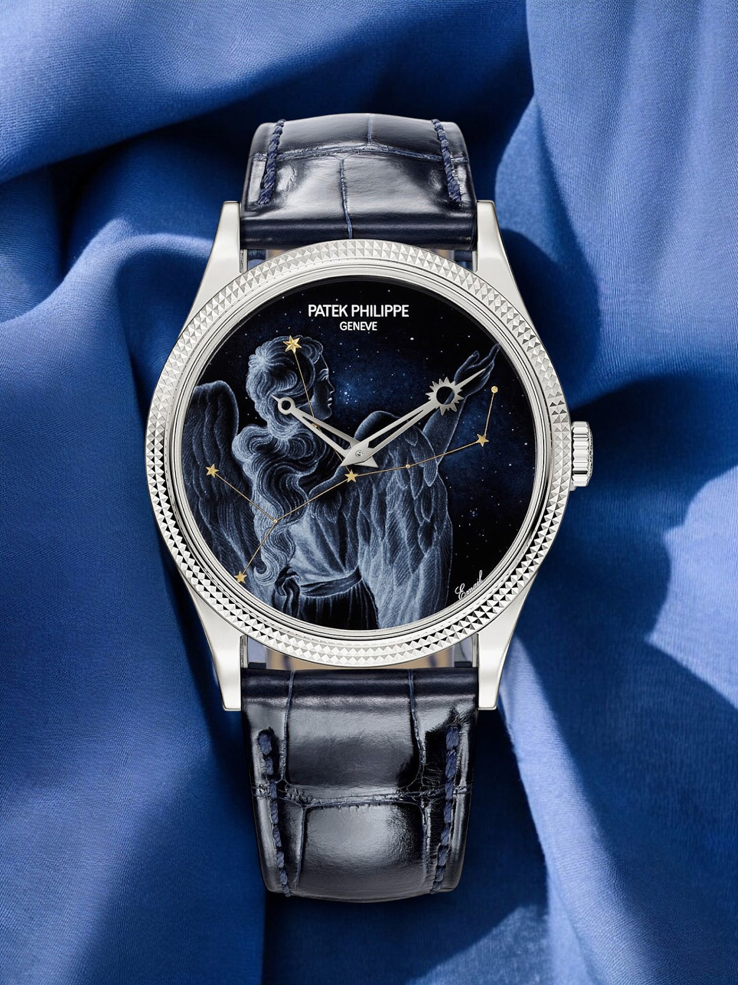 นำเสนอสัญลักษณ์ของจักรราศีและธาตุทั้งสี่ ต้อนรับในพื้นที่ส่วนกลางด้วยนาฬิกาข้อมือ Calatrava สุดพิเศษสิบสองเรือน ขอบตัวเรือนประดับด้วย Clous de Paris (คลูส์ เดอ ปารีส) หรือ hobnail guilloché (ฮ็อปเนล กิโยเช่) และหน้าปัดประดับด้วย grisaille enamel au blanc de Limoges, Grand Feu cloisonné enamel และ paillonné enamel (ไปยอนเน่ อีนาเมล) แสดงถึงกลุ่มดาวที่เกี่ยวข้องกับจักรราศีต่างๆ การตกแต่งเหล่านี้ นำมาจากภาพแกะสลักโบราณ แต่ตีความในสไตล์ที่ทันสมัย สะท้อนมิติอันน่าหลงใหล นำเสนอในรุ่นลิมิเต็ด อิดิชัน เพียงสิบสองชุด ชุดละสองเรือน จัดกลุ่มตามธาตุทั้งสี่ ตัวอย่างเช่น Virgo (5177G-043) สำหรับธาตุดิน Sagittarius (5177G-046) สำหรับธาตุไฟ Aquarius (5177G-048) สำหรับธาตุลม และ Pisces (5177G-049) สำหรับธาตุน้ำ