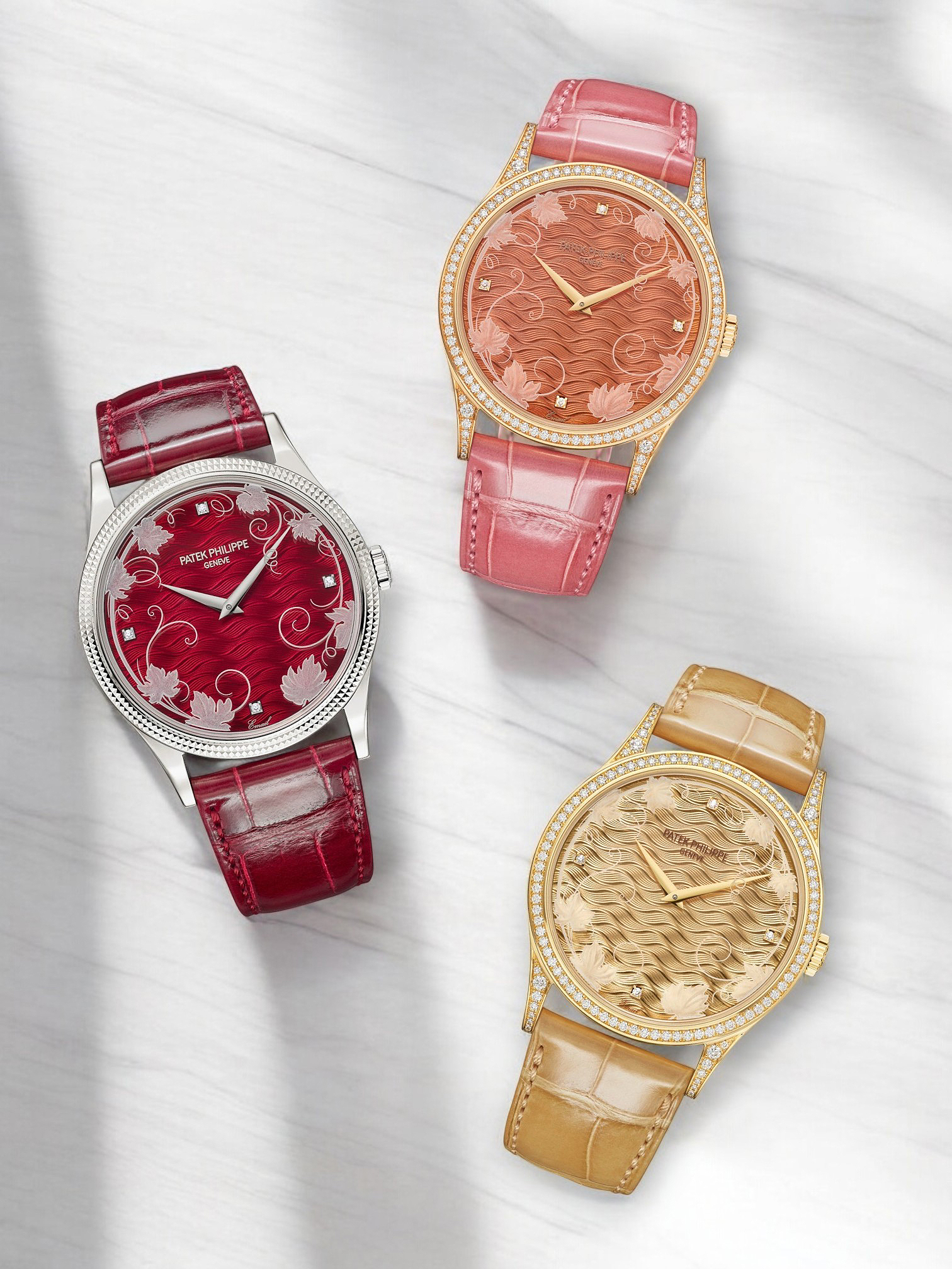 คอลเลกชัน “Rare Handcrafts 2025” แสดงความเคารพอย่างงดงามต่อศิลปะแห่งการปลูกองุ่นที่มีมาแต่บรรพบุรุษ ด้วยผลงานหกชิ้นที่มีการตกแต่งที่ประณีตงดงาม รุ่น Calatrava “Clous de Paris” (คลูส์ เดอ ปารีส) 5177G-050 & 5177G-051 “Vineyards and Chateaux” เน้นถึงเขตปลูกองุ่นฝรั่งเศสที่ยิ่งใหญ่ของแคว้น Burgundy (เบอร์กันดี หรือ Bourgogne) และ Bordeaux (บอร์โดซ์) นาฬิกา Calatravas 5077/100J-001, 5077/100R-066 & 5177G-052 “Vines and Wines” ฉลองเฉดสีและสีสันที่ไร้ขีดจำกัดที่พบในไวน์ขาว โรเซ่และแดง บนหน้าปัดใน flinqué enamel คริสตัลแซฟไฟร์แกะสลักด้วยมือ ซึ่งเป็นการตกแต่งในคอลเลกชัน Rare Handcrafts นาฬิกา Golden Ellipse 5738/50G032 “Dézaley Chemin de fer” ผสาน cloisonné enamel, miniature painting on enamel และ grisaille enamel au blanc de Limoges ในการตกแต่งที่ได้รับแรงบันดาลใจจากฉลากไวน์จาก Lavaux (ลาโวซ์) ในสวิตเซอร์แลนด์