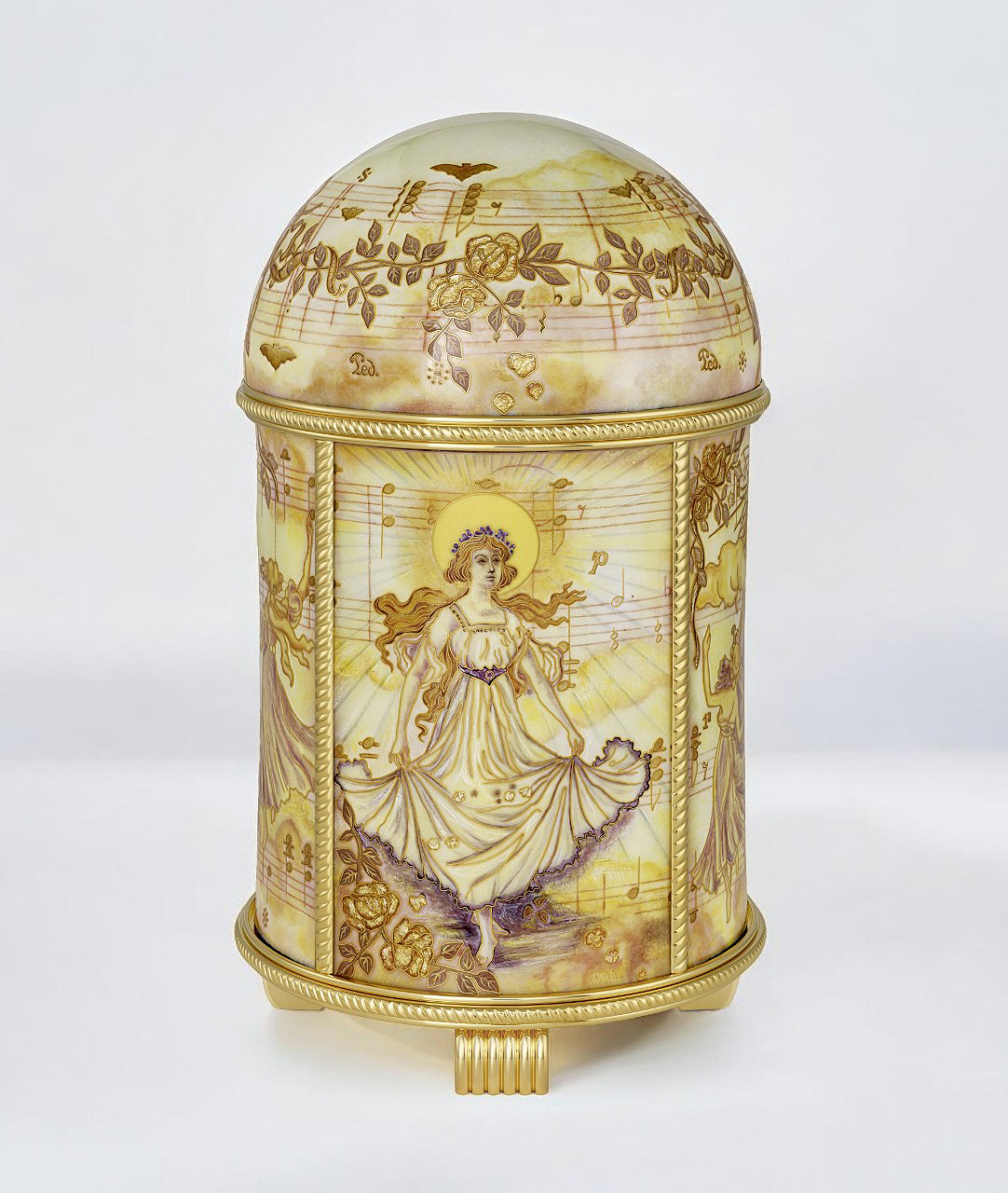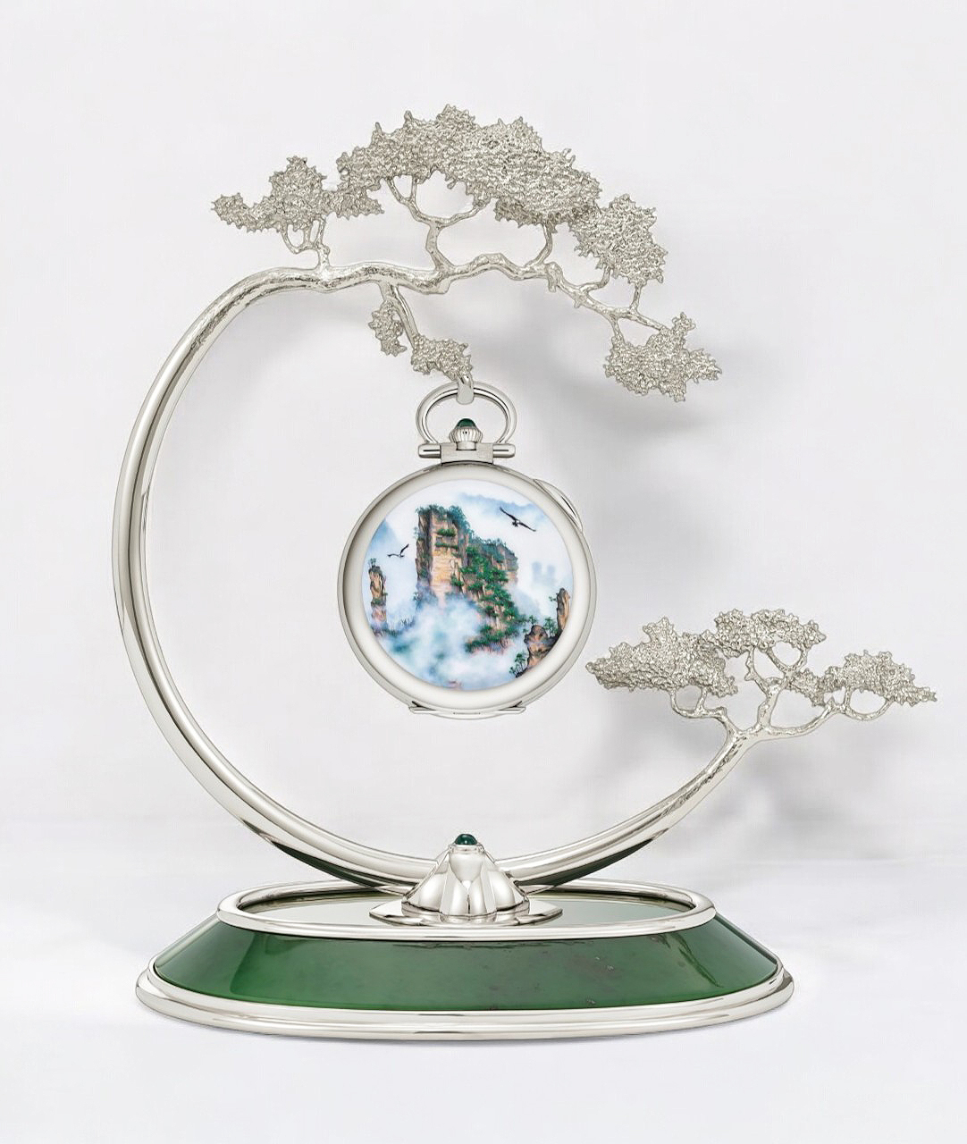 นาฬิกาพก 992/138G-001 “Zhangjiajie National Forest Park” สร้างสรรค์ทิวทัศน์อันยิ่งใหญ่ของอุทยานแห่งชาติชั้นนำของจีนขึ้นใหม่บนหน้าปัดใน miniature painting on enamel, hand engraving และ flinqué enameling นาฬิกาตั้งโต๊ะทรงโดมสองเรือนนำเสนอตามลำดับ เสียงร้องตามฤดูกาลของกวาง และป่าของต้นเบิร์ชสีเงินในฤดูใบไม้ร่วง