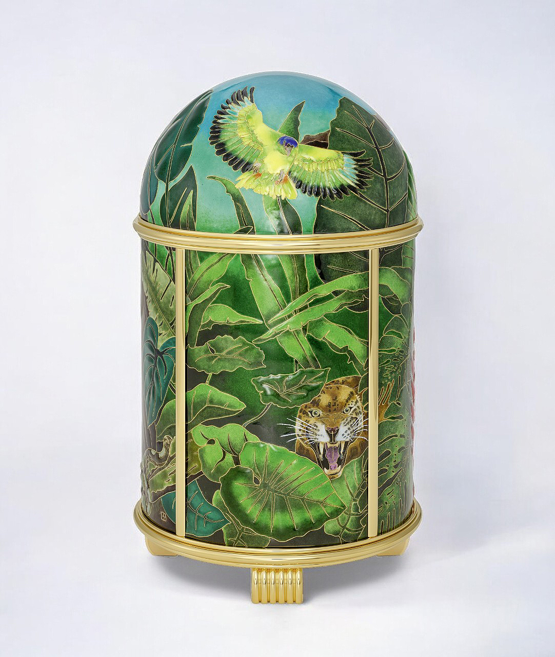 Grand Feu cloisonné enamel ใช้ในการผลิตนาฬิกามานาน สร้างสรรค์ลวดลายด้วยสีสันที่สดใสและคงทน ช่างฝีมือสร้างรูปร่างโครงร่างของลวดลายด้วยลวดทองคำเส้นเล็ก ๆ จากนั้นจึงเติม “cloisons” หรือเซลล์ที่เกิดขึ้นด้วย enamels โปร่งแสง ทึบแสง กึ่งทึบแสง หรือเหลือบสี
