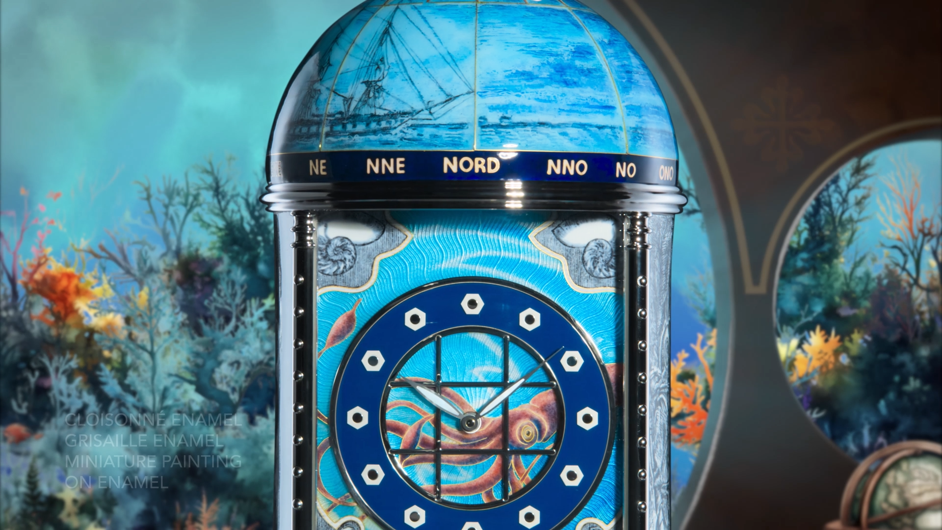 อีกสัญลักษณ์หนึ่งที่แสดงถึงมรดกอันน่าทึ่งของโรงงาน นาฬิกาตั้งโต๊ะทรงโดม Reference 20187M-001 “The Patek Waltz” ใน cloisonné และ paillonné enamel ประดับด้วย hand engraving ได้รับแรงบันดาลใจจากคะแนนเพลงที่แต่งขึ้นในปีค.ศ.1907 เพื่อเป็นเกียรติแก่บริษัทค้าปลีกชาวบราซิลที่ภักดีของ Gondolo & Labouriau