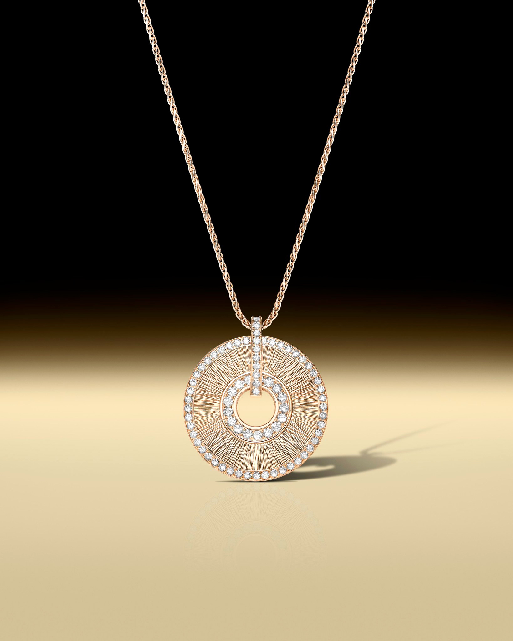 เริ่มจากสร้อยคอและจี้ขนาดเล็กที่มีให้เลือกทั้ง ตัวเรือนโรสโกลด์ หรือ ไวท์โกลด์ ประดับเพชรบริลเลียนต์คัตใจกลางตัวเรือน โอบล้อมด้วยดีไซน์คล้ายเครื่องหมายวงเล็บไว้อย่างมีชั้นเชิง เสริมด้วยกำไลข้อมือเข้าชุด ต่อด้วยจี้ขนาดกลางที่เติมลูกเล่นความสนุก ด้วยการนำทองคำขัดเงา หรือ ประดับเพชร ตัดสลับด้วยลวดลายเฉพาะตัวจากเทคนิค Palace Décor เปล่งประกายจากเพชรห่วงคล้อง