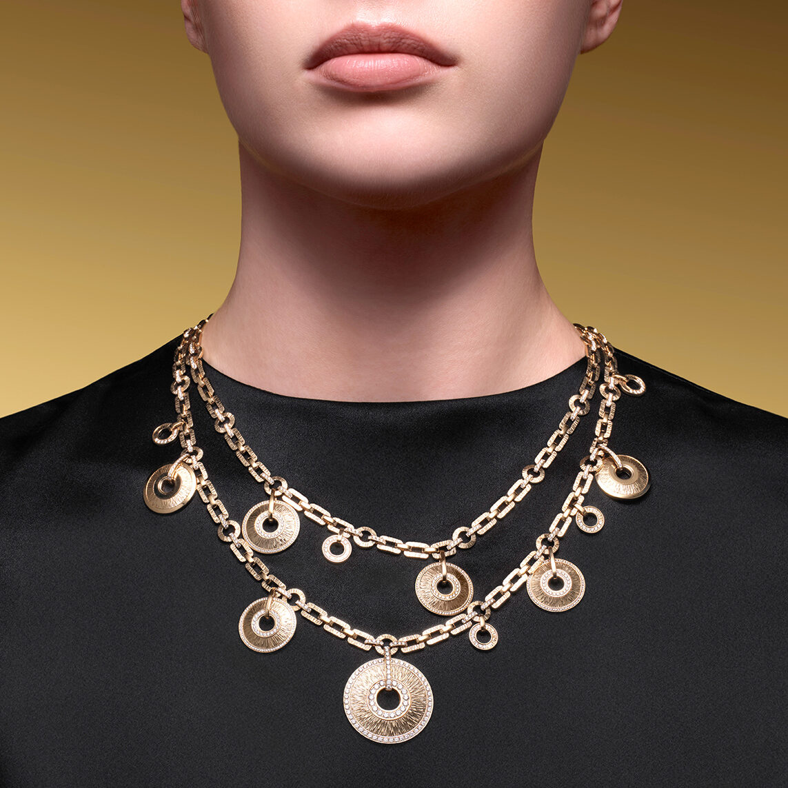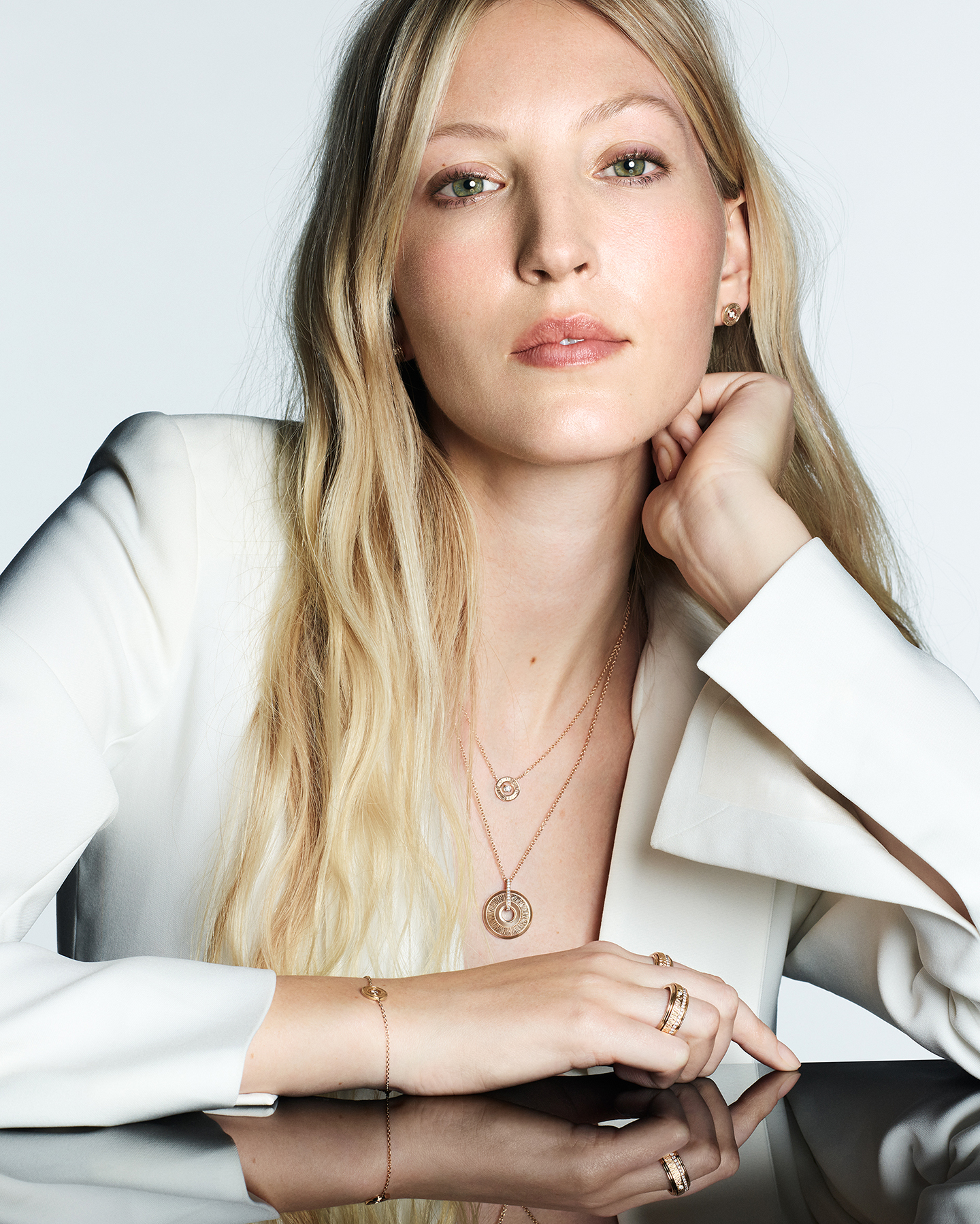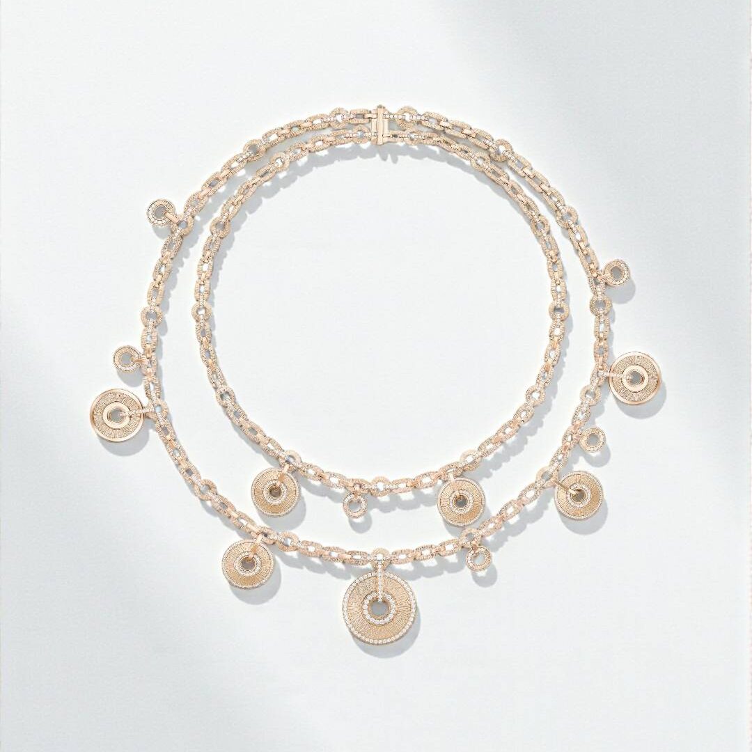 ปิดท้ายด้วยจี้ขนาดใหญ่ผสานสายโซ่ทองแบบ palm-mesh ใส่เข้าคู่กับต่างหูโรสโกลด์ เติมเต็มความยวนเย้าของคอลเลกชันนี้ให้สมบูรณ์แบบ สะกดสายตาด้วยสร้อยคอดีไซน์นำสมัยได้อย่างขบถนอกกรอบ ยกระดับความหรูหราด้วยตัวสร้อยประกอบด้วยจี้หลากหลายดีไซน์ทั้งแบบเรียบและประดับเพชรน้ำหนักรวม 8 กะรัต ร้อยเรียงอยู่บนสายโซ่ที่มีความยาวต่างกัน 2 เส้น บ่งบอกถึงความพิถีพิถันของ Piaget ในทุกมิติ