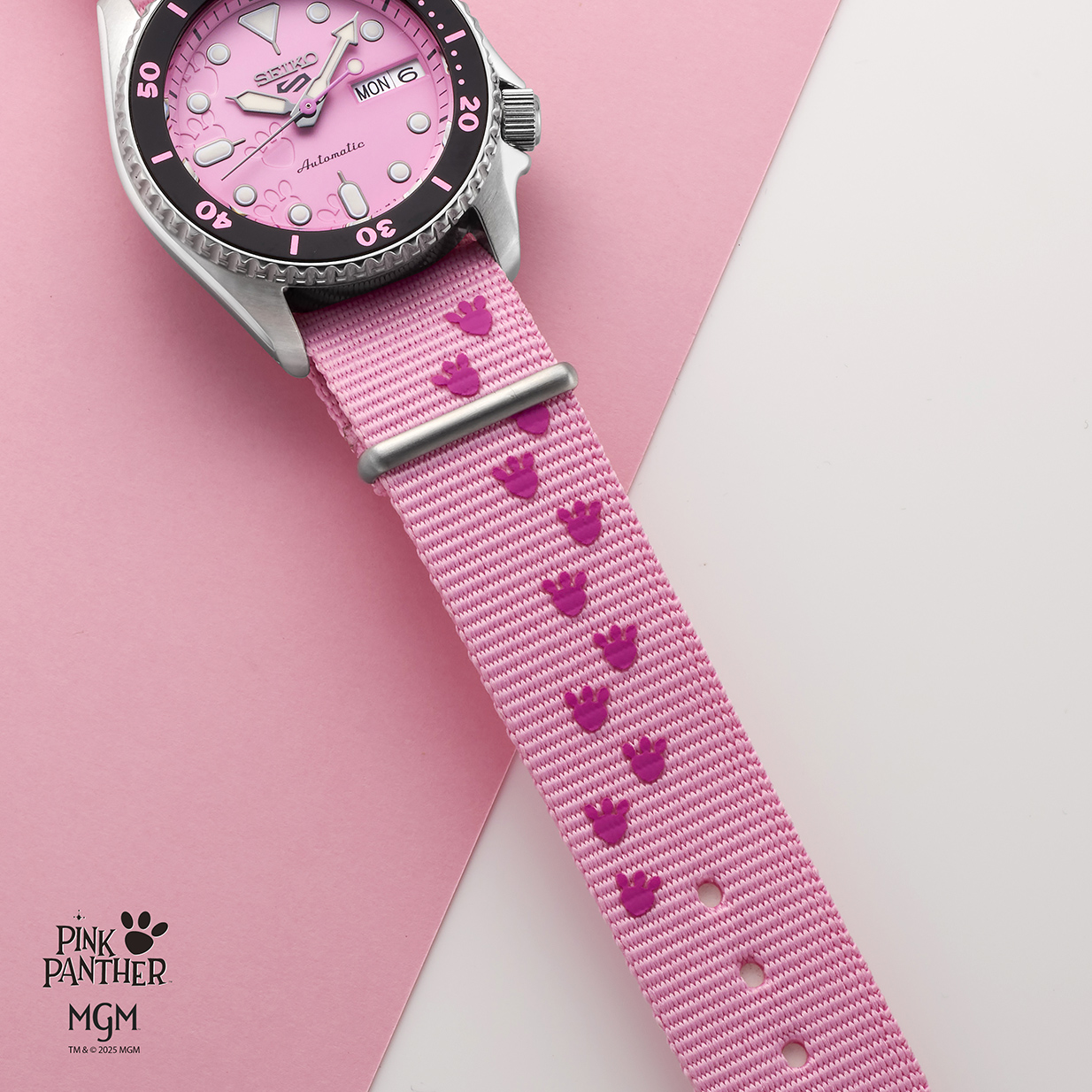 Seiko 5 Sports Pink Panther Limited Edition ถ่ายทอดโลกแอนิเมชันแนวตลกจาก The Pink Panther จากฉากเรื่องราวที่ Pink Panther แอบทาสีบ้านของ Little Man ให้เป็นสีชมพู สะท้อนอยู่ในดีไซน์ผ่านตัวนาฬิกา ทั้งหน้าปัด ขอบเบเซลและเข็มวินาทีที่เติมแต่งด้วยสีประจำตัวของตัวละครนี้ ถ่ายทอดดีไซน์จากคาแรกเตอร์ที่ซุกซนและขี้เล่นของ Pink Panther ที่ช่วยเติมสีสันให้กับชีวิตประจำวันบนข้อมือ
