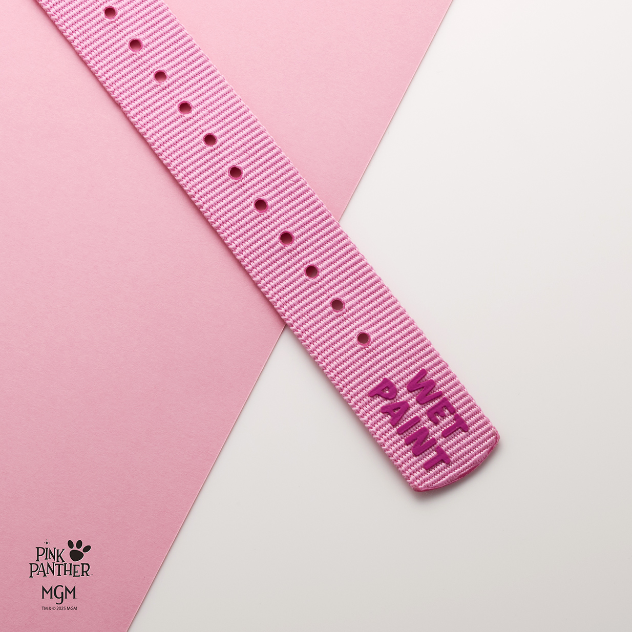 เสริมลูกเล่นด้วยสายไนลอนเส้นที่สอง สไตล์นาโต้สีชมพูปริ้นต์ลวดลายที่เป็นรอยเท้าของ Pink Panther เช่นกัน ปลายสายพิมพ์คำว่า “Wet Paint” ตามแบบที่ปรากฏอยู่ในแอนิเมชันต้นฉบับ ซึ่งเป็นฟอนต์เดียวกันกับตัวเลขบนขอบเบเซลสีดำ ถ่ายทอดเอกลักษณ์ความขี้เล่นของแอนิเมชันคลาสสิกในทุกรายละเอียดอย่างครบถ้วน
