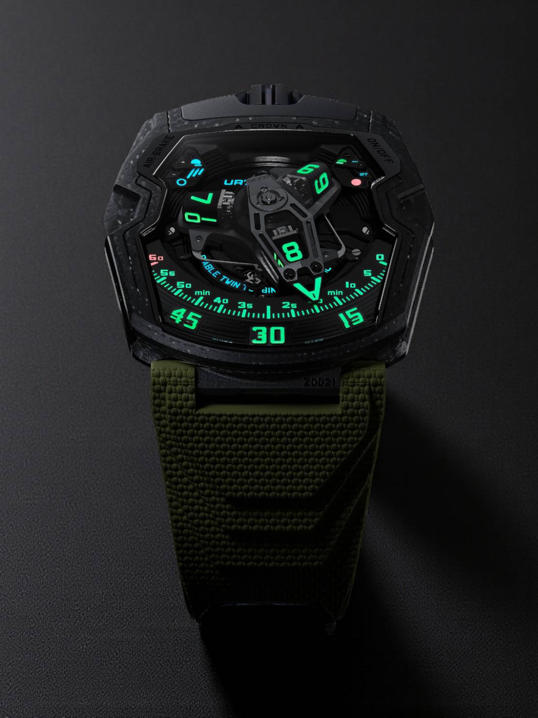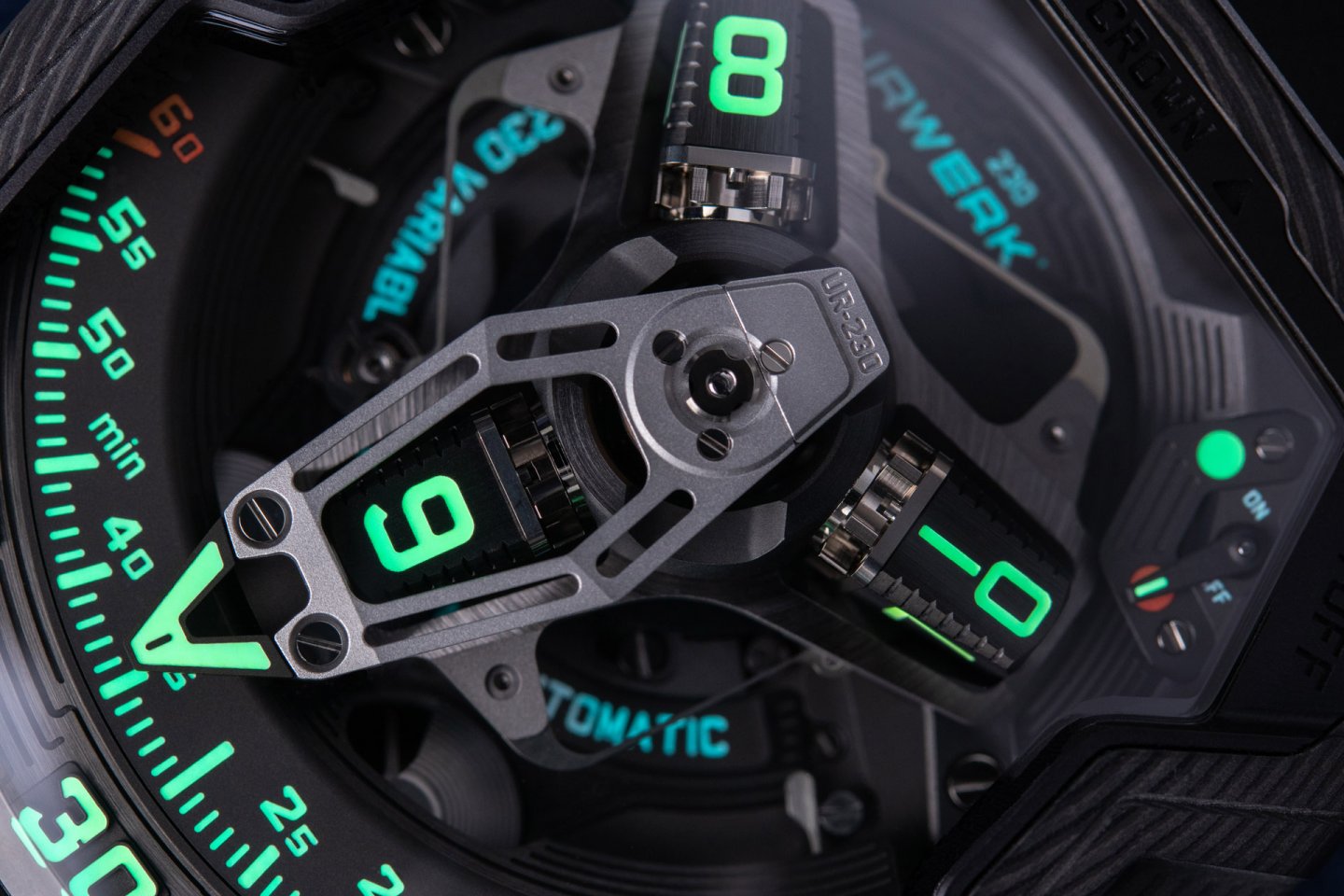 UR-230 นาฬิกากลไกอัตโนมัติที่ควบคุมการทำงานด้วยระบบใบพัดทรงกังหันคู่ มาตรแสดงสองตำแหน่งซึ่งจัดวางอย่างสมมาตรที่ตำแหน่ง 11 นาฬิกาและ 1 นาฬิกา จะแสดงการตั้งค่านี้ ซึ่งพัฒนาเฉพาะสำหรับนาฬิการุ่นนี้ ใบพัดหนึ่งทำหน้าที่ดูดซับแรงกระแทกจากภายนอก อีกใบพัดทำหน้าที่ควบคุมการไหลเวียนของอากาศในกลไกขึ้นลานอัตโนมัติ เสมือนเบรกอากาศพลศาสตร์ ฝาหลังมีตัวควบคุมที่ช่วยปรับระดับการทำงานของโรเตอร์ได้ หรือแม้แต่ปิดการทำงานเพื่อสลับไปใช้โหมดไขลานด้วยมือ