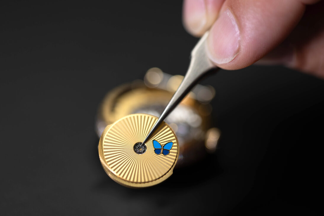 นาฬิกาข้อมือระบบซ้อนกลไก “ผีเสื้อบอกเวลา” Lady Lucky Spring Butterfly มอบความละเมียดละไมในอารมณ์ให้กับทุกครายามก้มลงดูหน้าปัดรองรับศิลปะจัดตำแหน่งดอกเหมยแม่มุกขาวเดินขอบลูกปัดทองคำสีเหลืองต่างมิติขนาดทั้งสามให้ลดหลั่นไล่ระดับความสูงเหนือกิ่งทองคำขัดเงาตัดกับเนื้อทองแต่งรายละเอียดของกลีบใบท่ามกลางงานเดินขอบลูกปัดทองเช่นเดียวกับ “กรอบหน้าต่าง” รูปทรงดอกตูมลิลลี-ออฟ-เธอะ-วัลเลย์เป็นช่องว่างเผยให้เห็นแผ่นจานหมุนแม่มุกขาว ติดตั้งตัวเลขบอกชั่วโมงภายในกรอบตัวเรือนอยู่ด้านล่างพื้นหน้าปัด ตัดเฉดกับช่อดอกไม้อย่างงามสง่าด้วยการใช้แผ่นแม่มุกขาวสลักลายริ้วรัศมีตะวัน guilloche (กิโยเช่) เคลือบสีน้ำเงินสดเข้ม ลูกเล่นลายร่องเส้นตรงจากงานสลักยังอำนวยต่อการรับแสงตกกระทบ ให้พื้นผิวอินทรีย์ วัตถุธรรมชาติสะท้อนประกายสว่างเรืองรองรอบทิศทาง