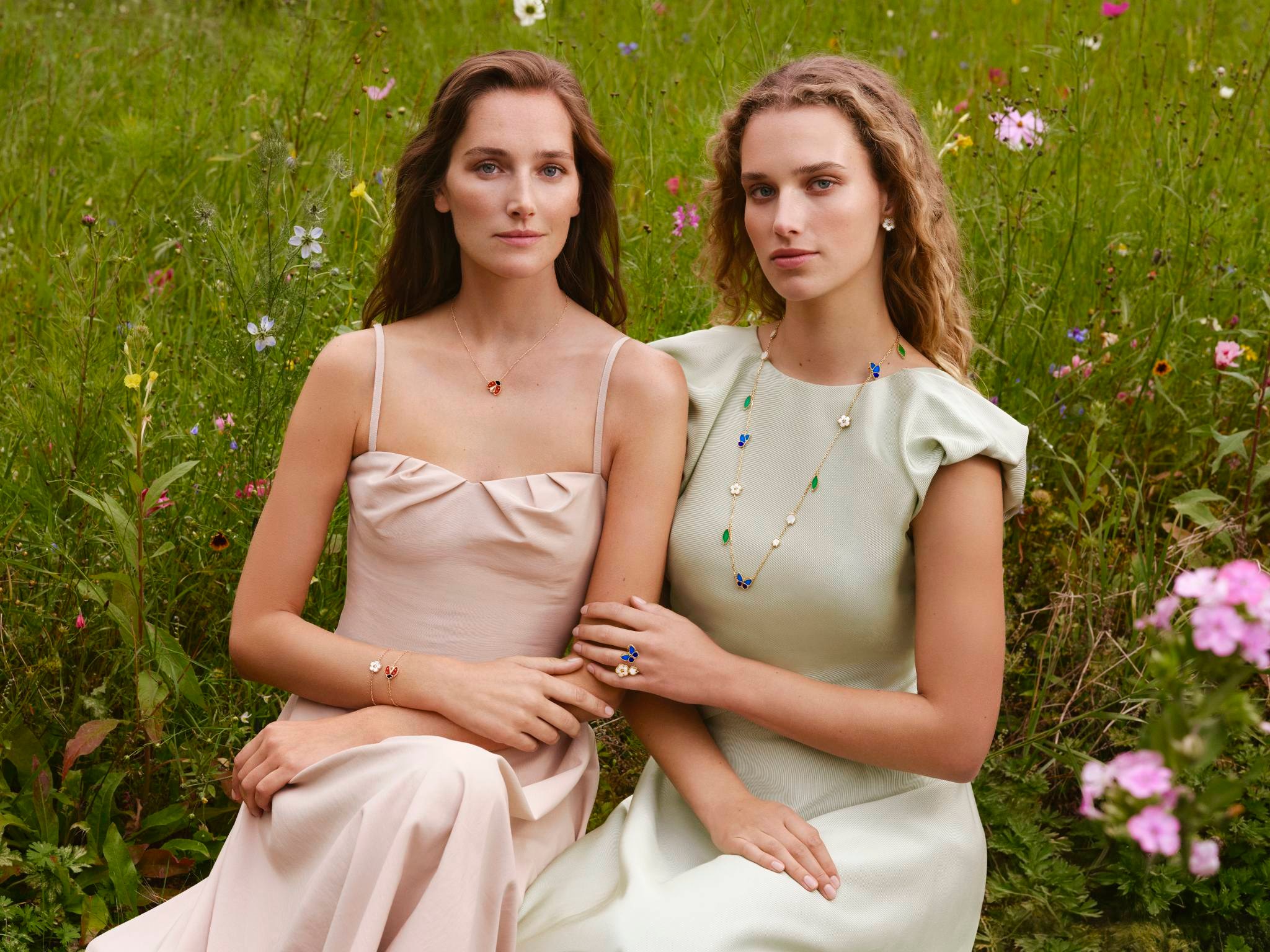 สำหรับสร้อยคอยาว มอบความอ่อนช้อยจากงานร้อยโมทิฟผีเสื้อกางปีกสามตัวสลับ คั่นกับโมทิฟแม่ลายอื่นบนสายโซ่โดยอาศัยการจัดสัดส่วนอสมมาตร แหวนหว่างนิ้วหรือ Between the Finger ring เป็นหนึ่งในสัญลักษณ์ทางงานออกแบบของเมซง ใช้โครงสร้างตัวเรือนวงแหวนปลายเปิดร่วมกับลูกเล่นอสมมาตรทางการตกแต่ง เช่นเดียวกับผลงานรุ่นล่าสุดในคอลเลกชันประจำฤดูกาลนี้ ขณะที่ปลายข้างหนึ่งรองรับลูกเล่นจัดตำแหน่งต่างระดับของโมทิฟมาเธอร์-ออฟ-เพิร์ลสีขาวเดินขอบลูกปัดทองแม่ลายดอกเหมยผลิบานกับดอกตูมลิลลี-ออฟ-เธอะ-วัลเลย์ ปลายเปิดฝั่งตรงข้ามคือความงามสง่าของผีเสื้อกางปีกเดินขอบ และเดินเส้นลูกปัดทองกลมกลืนกับตัวเรือนทองคำสีเหลืองจรัสประกายสุกสกาวราวแสงแรกแห่งฤดูใบไม้ผลิ