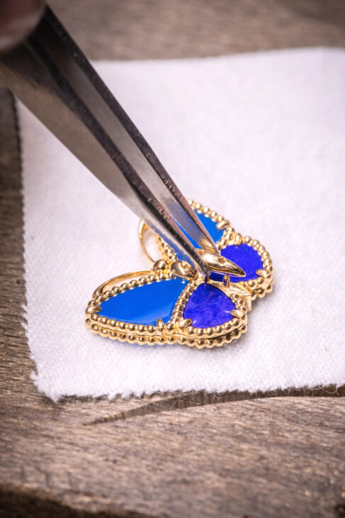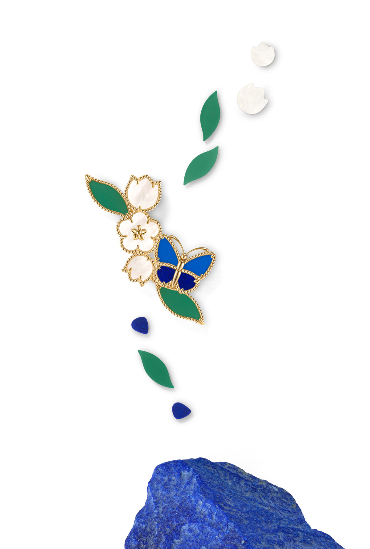 เครื่องประดับแต่ละชิ้น แต่ละรุ่นในคอลเลกชัน Lucky Spring จุดประกายปรารถนาให้ครอบครองจากงานออกแบบรังสรรค์พรรณพฤกษาและเหล่าแมลงต่างความหมายมงคล ในปีนี้ผีเสื้อเจ้าของปีกหลากสีสัน ตัวแทนแห่งอิสระและการเปลี่ยนแปลงสู่ความสำเร็จ อีกทั้งเป็นส่วนหนึ่งของมรดกทางการสร้างสรรค์ของเมซงมานับแต่ปีค.ศ.1906 เข้ามาโบยบินเติมเต็มแก่คอลเลกชันผ่านการเรียงร้อยแผ่นโมราสีฟ้าสดเป็นคู่ปีกบนอยู่เหนือคู่ปีกล่างทำจากพลอยน้ำสมุทรลาพิซ ลาซูลิตัดเฉดกับตัวเรือนทองคำสีเหลืองเดินขอบลูกปัดทองเรียงแถวคู่ขนาน สะท้อนรสนิยมอันเป็นเลิศในการเลือกสรรรัตนชาติของเมซง