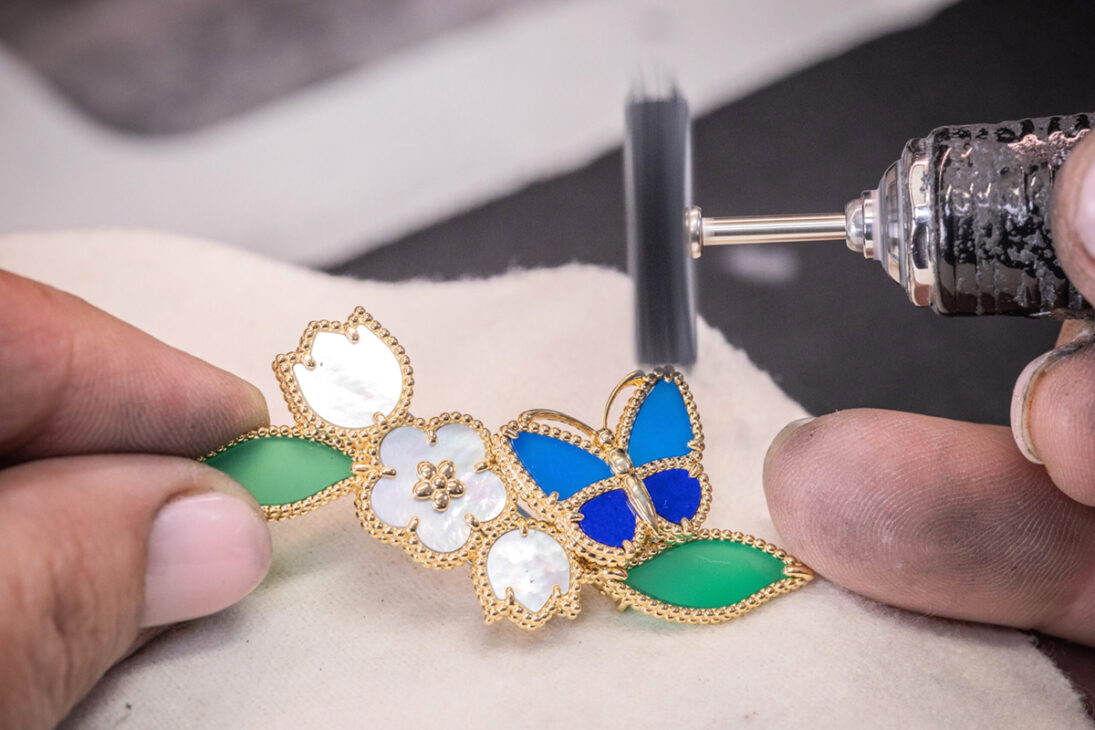 บรรดาวัสดุที่นำมาตกแต่งและประดิษฐ์เป็นรายละเอียดพรรณพฤกษา ล้วนผ่านการตรวจสอบ คัดสรรความเป็นเลิศของเมซงเช่นเดียวกับโมราสีฟ้าสำหรับตัดเจียนเป็นปีกบนของผีเสื้อ และโมราสีเขียวในส่วนของใบไม้ในผลงานรุ่นล่าสุดจากคอลเลกชัน Lucky Spring ซึ่งเมซงได้เลือกใช้เฉพาะรงคศิลาขนาดเล็กที่มอบเนื้อสีสดสว่าง สม่ำเสมอและกลมกลืนด้วยระดับโทนอ่อนจนถึงเข้มทั้งสีฟ้า และสีเขียวเพื่อให้มั่นใจในความลงตัวทางเฉดโทนยามอยู่ร่วมกันบนชิ้นงาน ทวีความโดดเด่นด้วยประกายเหลือบเรืองของแม่มุก หรือมาเธอร์-ออฟ-เพิร์ลสีขาว ประกายเงางามระยับแสง