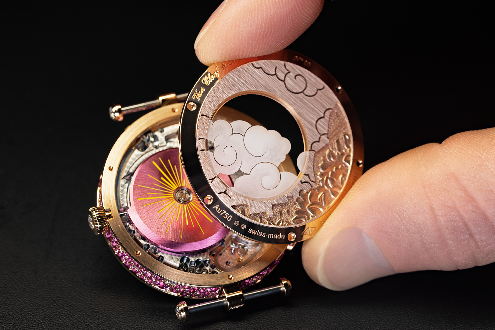 ตัวเรือนทองคำสีกุหลาบประดับเพชร ไพลินสีชมพูและงานลงยา กลไกขับเคลื่อนแบบขึ้นลานอัตโนมัติในตัวร่วมกับกลไกเข็มตีกลับระบบคู่ และหุ่นกลบอกเวลาตามสั่ง